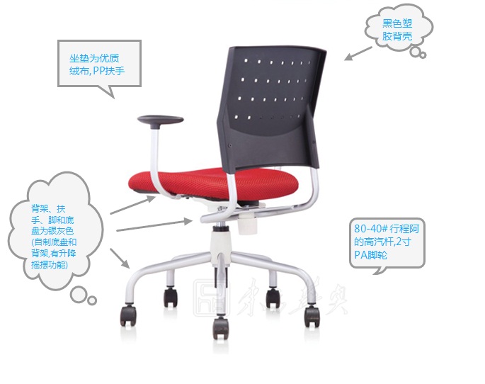 A:黑色塑膠背殼,背架、扶手、腳和底盤為銀灰色.坐墊為優質絨布,PP扶手面.