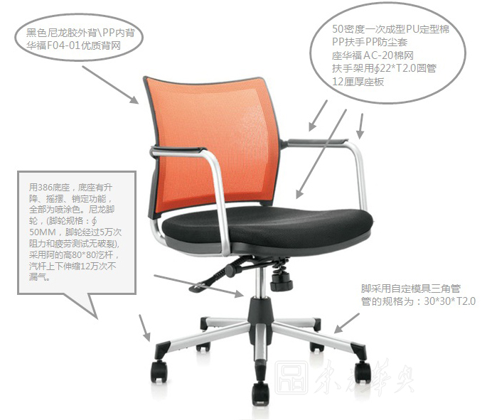 A:黑色尼龍膠外背,50密度一次成型PU定型棉,PP扶手PP防塵套和PP內背,用華福